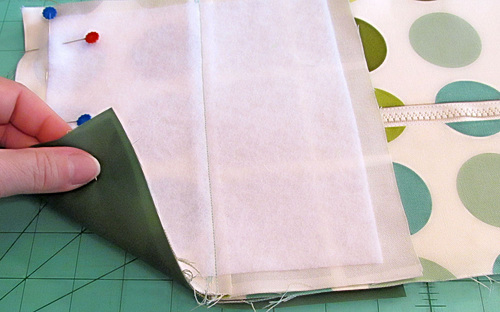 - As shown above, following manufacturer’s instructions, fuse the mid-weight interfacing to the wrong side of the exterior pocket. The side and bottom edges are flush and the angled top edge of the interfacing sits ½” in from the fabric.