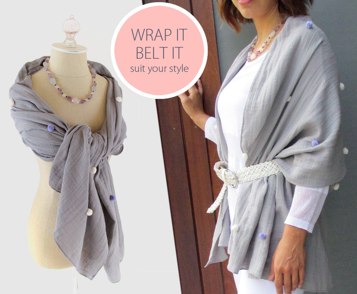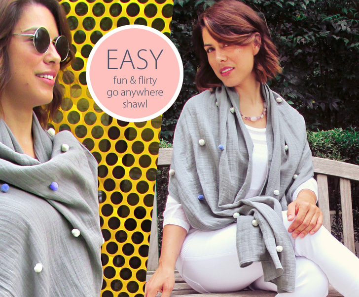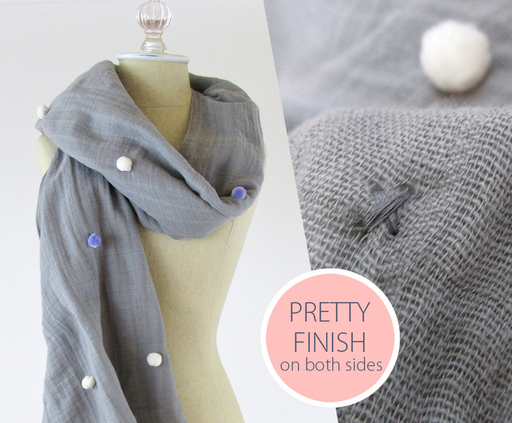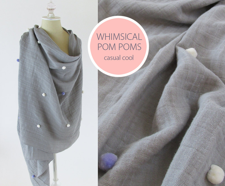The hand-stitched single poms are sprinkled randomly across the shawl. Just as soft as the double gauze, they didn’t interfere at all with any of the wrapping, twisting or tying wearable techniques we tried on our sample.