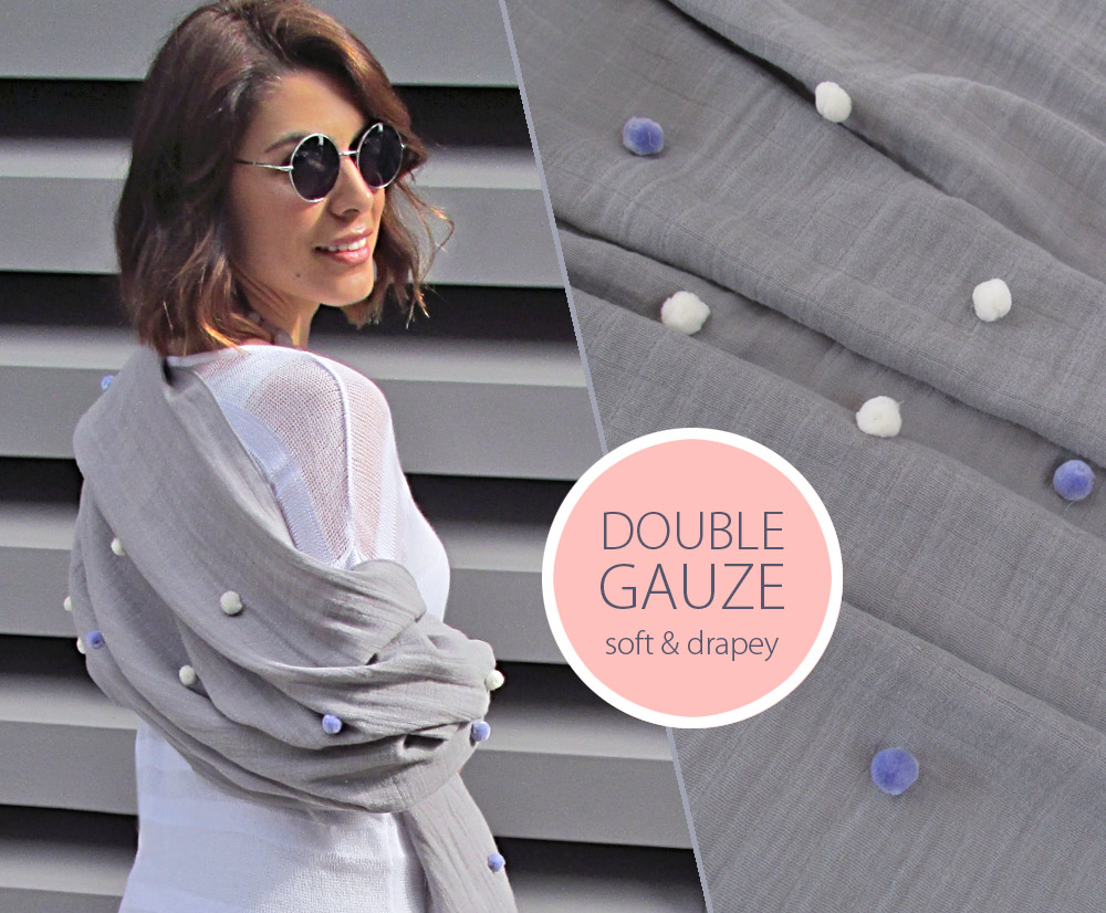 Most of us recognize regular gauze for its sheer open weave. In fact, the process that creates gauze is even called “gauze weave” (or “leno weave”). This weaving process twists two warp yarns around the weft yarn in a figure eight pattern, resulting in a strong yet sheer fabric. Double gauze is just that, two layers of gauze. Teeny tiny stitch tacks, so teeny and tiny as to be invisible from the right side of the fabric, hold the layers together. These double layers help eliminate the super-sheerness of standard gauze and give the fabric a bit of extra weight, which imparts a wonderful, almost velvety drape. We designed a project that takes full advantage of this swathe of softness as well as the fabric’s 52″/54″ width: a striking shawl wrap with pom accents for a kick of casual whimsy.