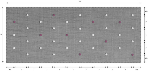 - The drawing below shows you the “random” pattern we choose for our 35 poms and the measurement points. You could of course add more, do less, or eliminate them altogether… although that would be sad, because they’re so cute!