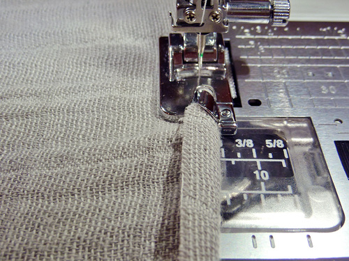 - We opted to make a rolled hem with our machine, turning in the raw edge ⅜” all around to feed into a Rolled Hem foot.