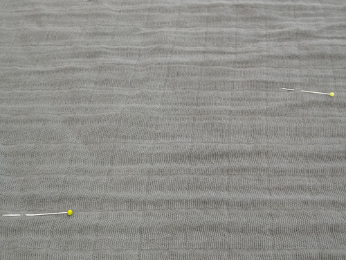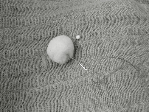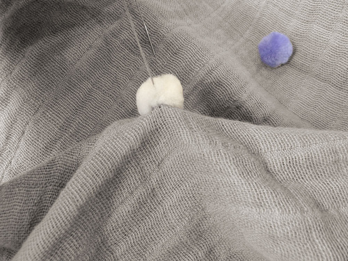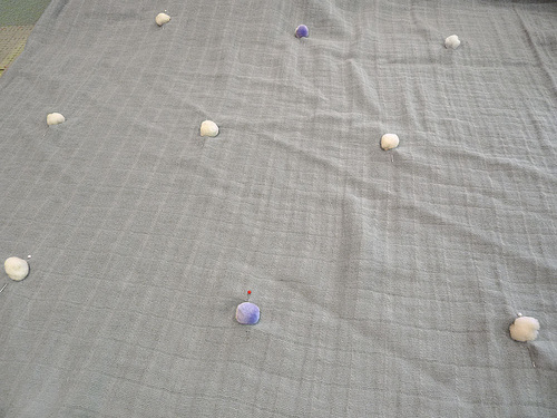 - As mentioned above with the cutting, the woven pattern on the gauze acts as a handy grid, which makes placing the poms much easier. First, decide on each point and mark with a pin.