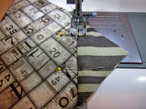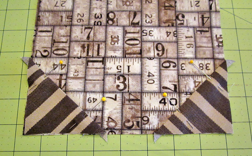 Using the pattern, fussy cut FOUR corners as shown below to create diagonal stripes