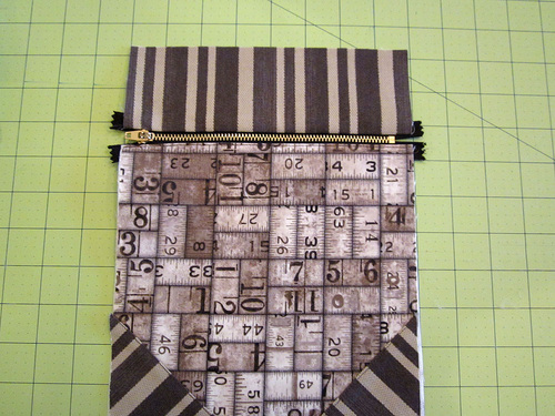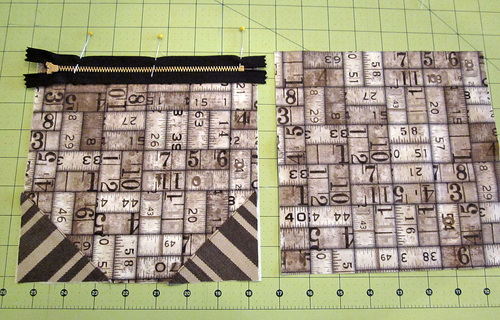 - Place the front zippered pocket panel right side up on the remaining Ticking panel, aligning all the raw edges. Pin in place.