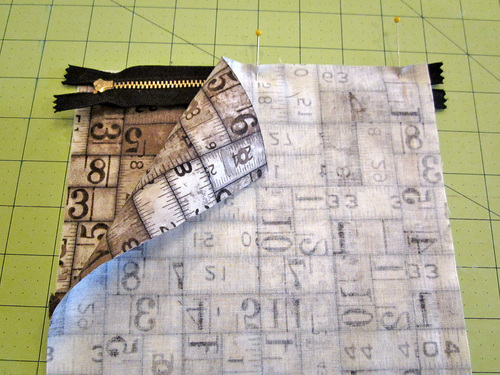 - Using a ¼” seam allowance, stitch across the panel through all three layers (two fabric layers plus one zipper layer). You should be stitching close to the zipper teeth.