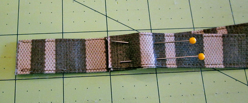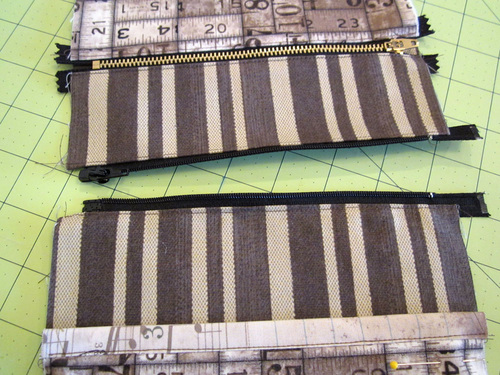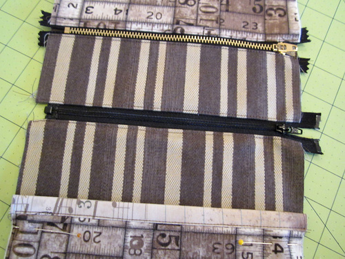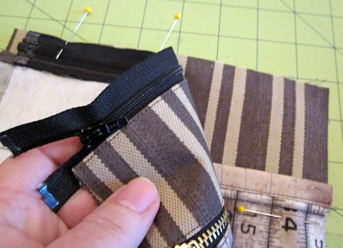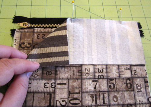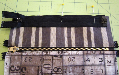 - Place the fused Ticking strip along the remaining free edge of the zipper. The fabric and the zipper are right sides together. Pin in place.