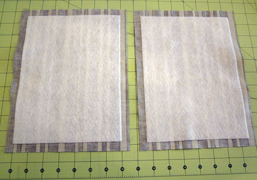 - Find the two 8″ x 10½” Ticking panels and the two 7¼” x 10″ pieces of fusible fleece.