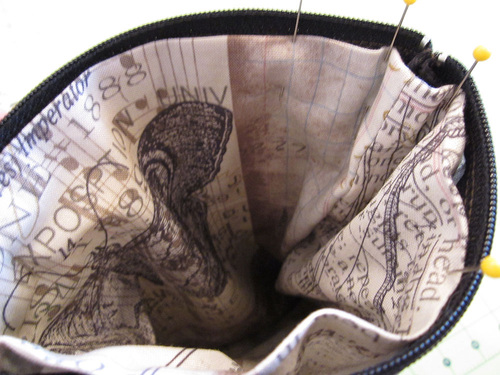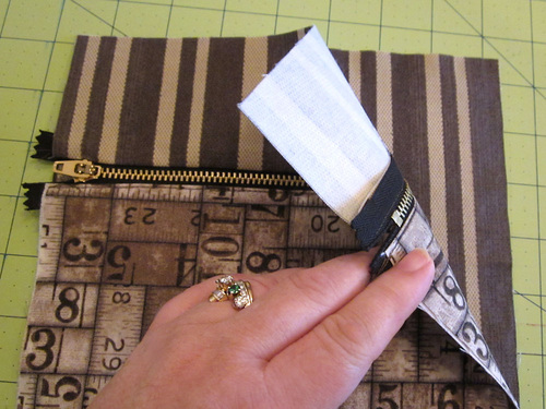 - Align the bottom and side seams. The top folded edge of the bag should fall below the zipper teeth by about ⅛”. If it doesn’t, adjust the lining fold to fit and gently re-press.