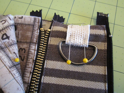 - Find the 2″ length of cotton webbing and the D-ring. Slip the webbing through the D-ring. Align the raw ends of the webbing. Pin the webbing in place on the left side of the front panel, centered within the top Ticking strip. The ends of the webbing should be flush with the raw edge of the fabric.