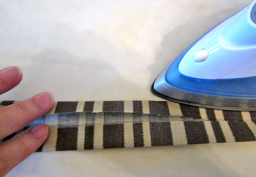 - Open the strip wrong side up so the crease line is visible. Fold in each raw edge so they meet one another at the center crease line. Press well.