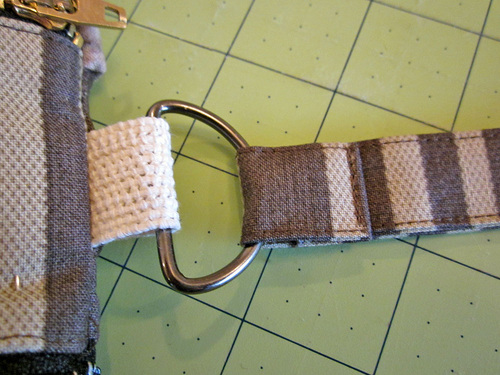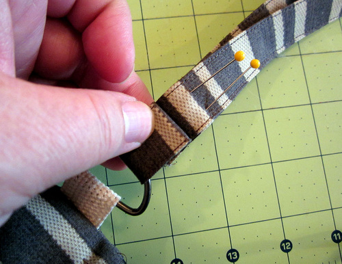 - Find the completed sleeve. Slip the longer end of the strap through the D-ring. Fold under the raw end ½” then place this folded end against the strap so it conceals the unfinished edge of the pinned-in-place end.