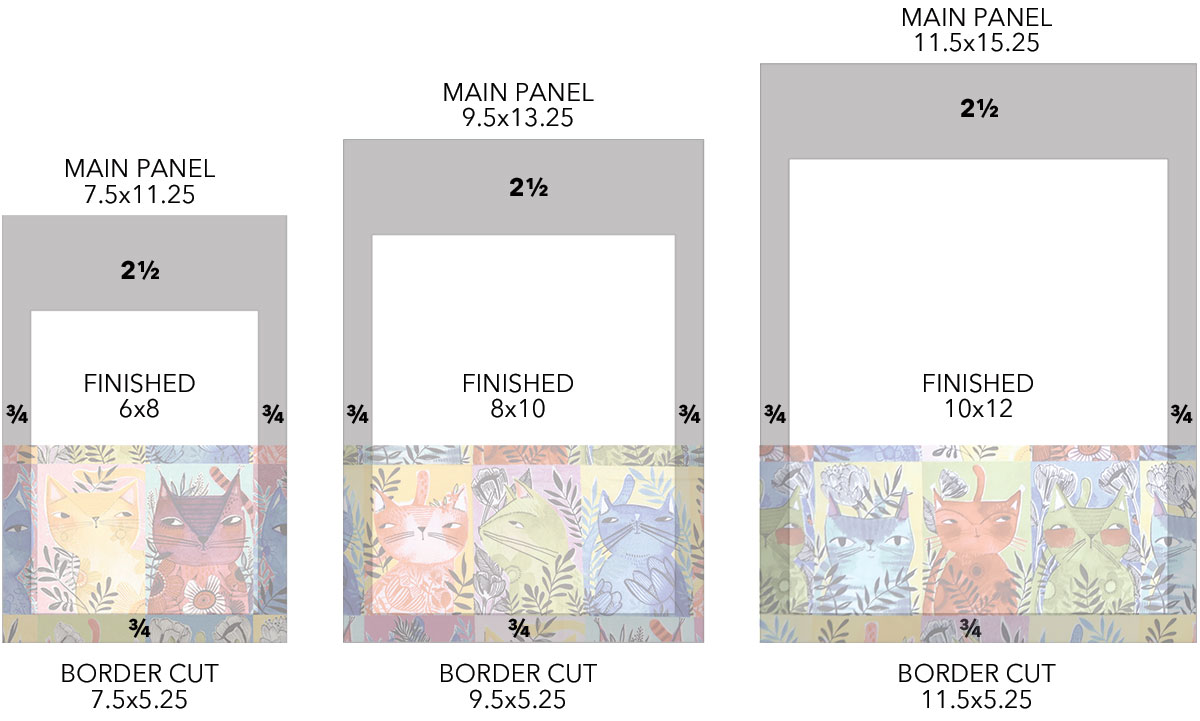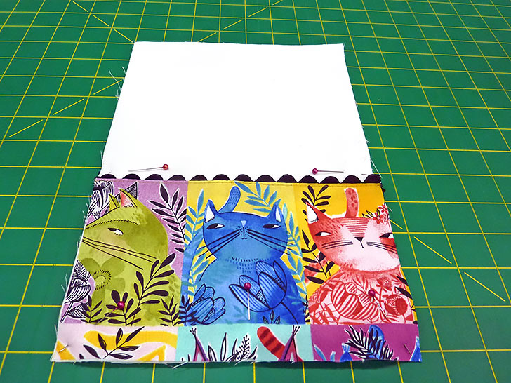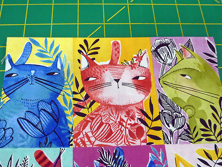 NOTE: Refer to the diagrams above to see how we positioned our Here Kitty Kitty fabric to best center our kitty squares, accounting for ½” above each cut and ¾” along each side and across the bottom.