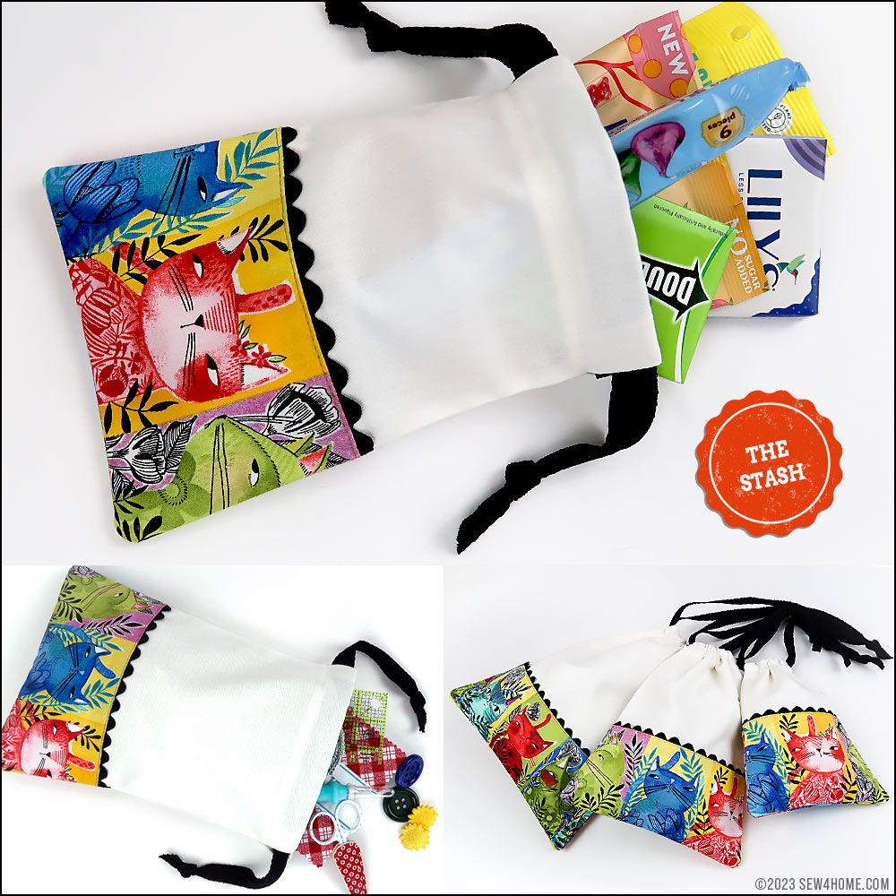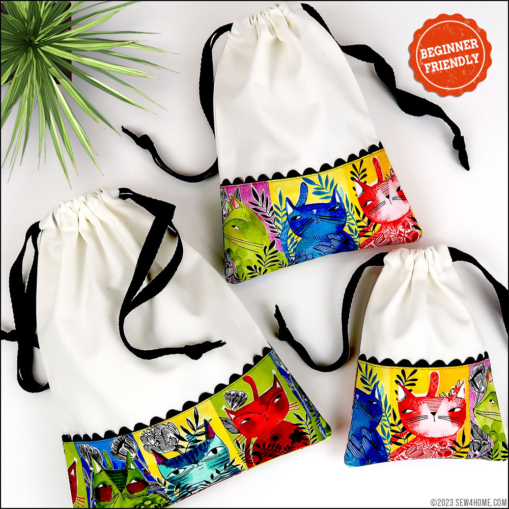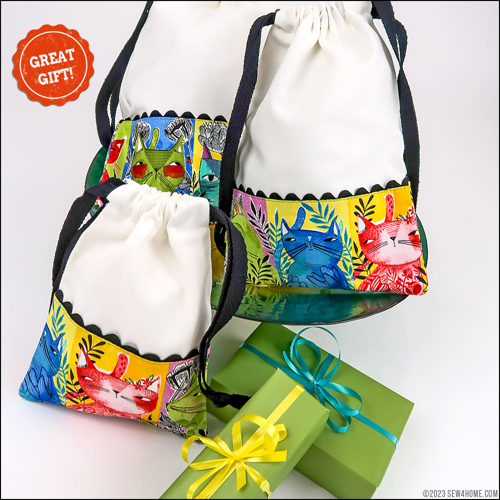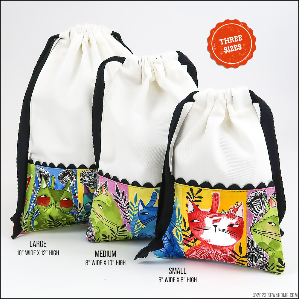 Each of our sample bags features slightly different kitty faces, but they all blend together as a set thanks to the matching main panels, rick rack, and cotton twill drawcords.You need just small cuts for any/all of the bags, so this would also be an excellent ScrapBusters project whether making one, two or all three bags. Each cut is detailed for the Small, Medium, and Large version within the Getting Started section below.