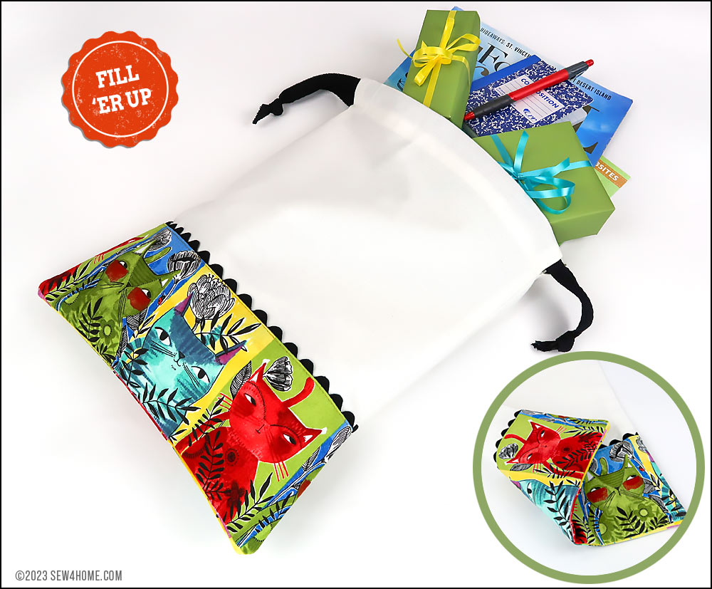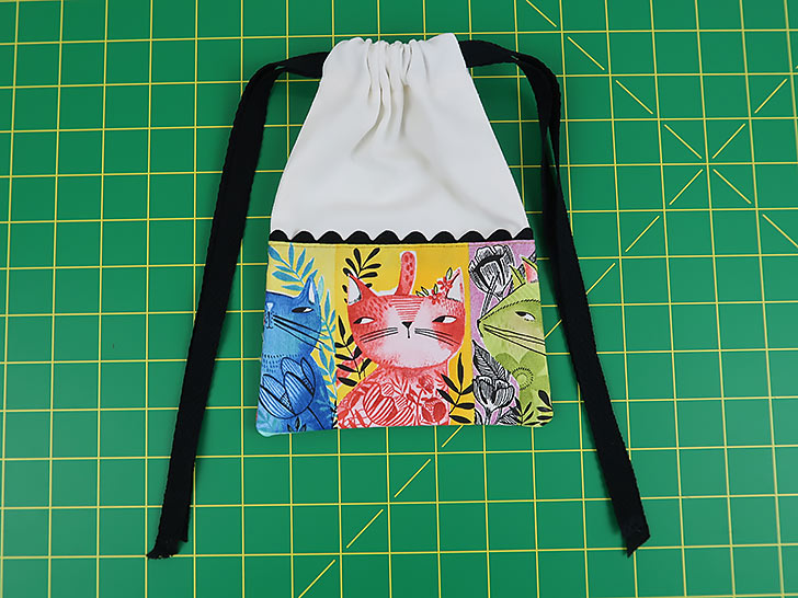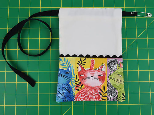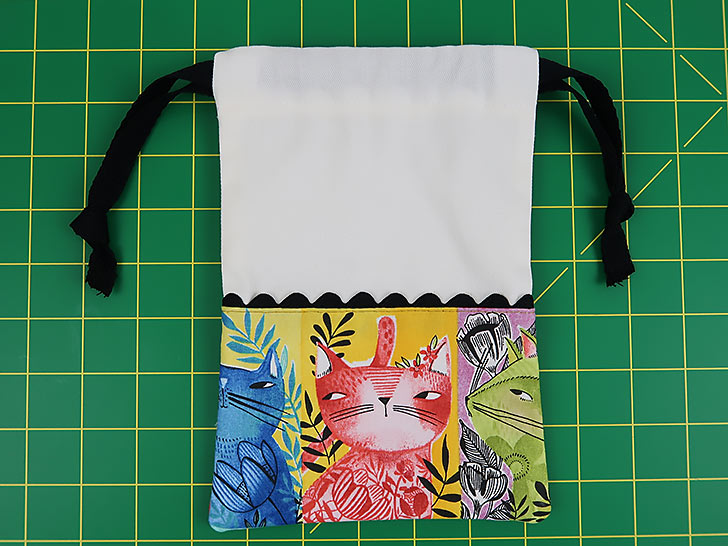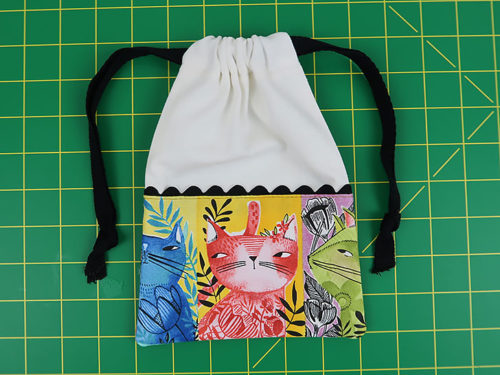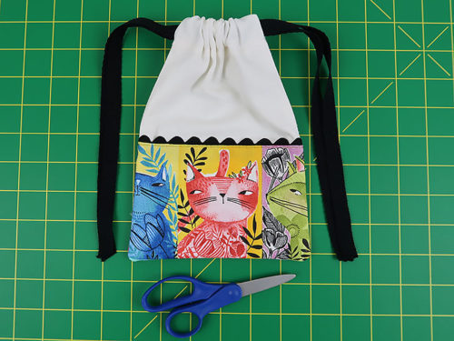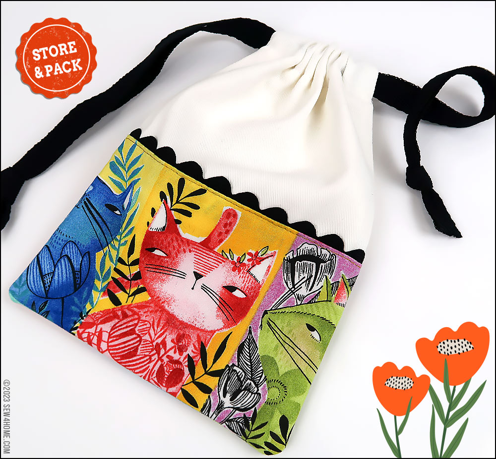 Each of our sample bags features slightly different kitty faces, but they all blend together as a set thanks to the matching main panels, rick rack, and cotton twill drawcords.You need just small cuts for any/all of the bags, so this would also be an excellent ScrapBusters project whether making one, two or all three bags. Each cut is detailed for the Small, Medium, and Large version within the Getting Started section below.