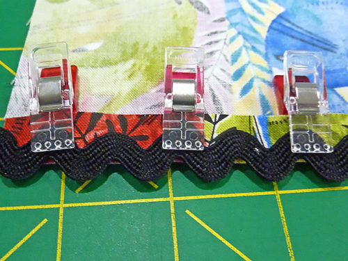 - Find the two lengths of rick rack to match the border. The rick rack is designed to have a “half wave” reveal along the top folded edge. To insure this reveal is nice and straight, place the border right side down on your work surface, with the fold at the top. Place the rick rack across the folded edge so the center of the rick rick is right along the fold. Clip or pin in place. You are only pinning the rick rack to the fold itself; do not pin all the way through to the front of the accent panel.
