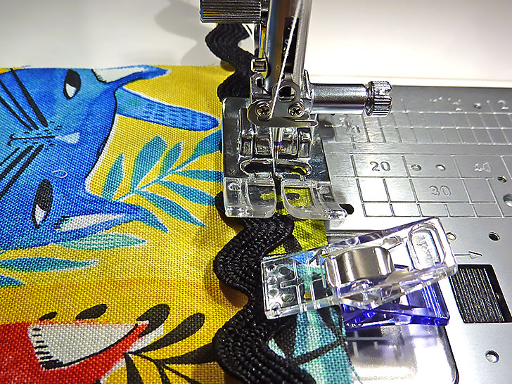 - Un-fold the top edge and machine baste the rick rack in place, keeping your seam close to the bottom edge of the rick rack as shown in the photo below. Remove the pins/clips as you stitch.