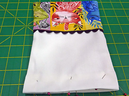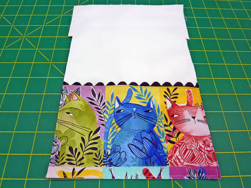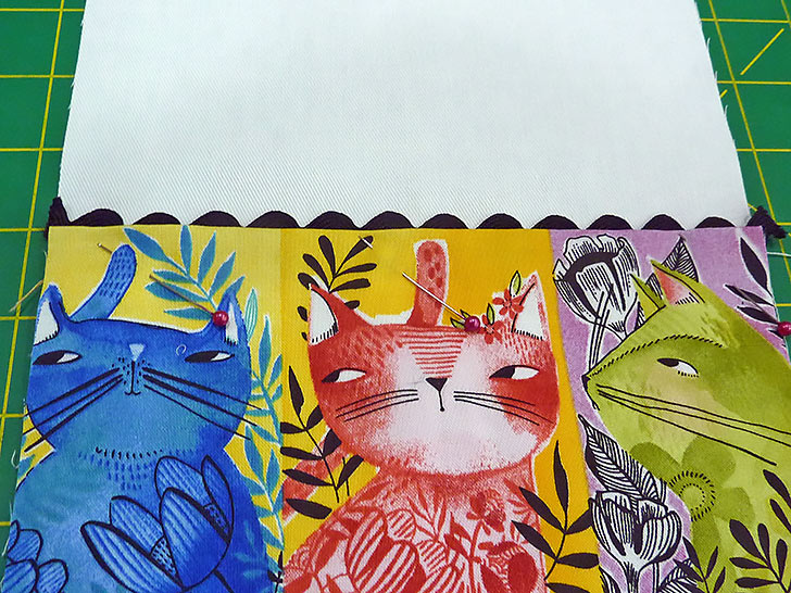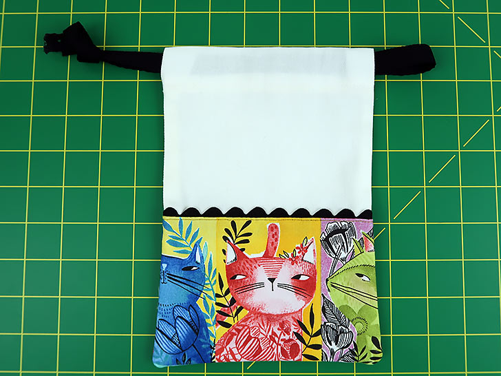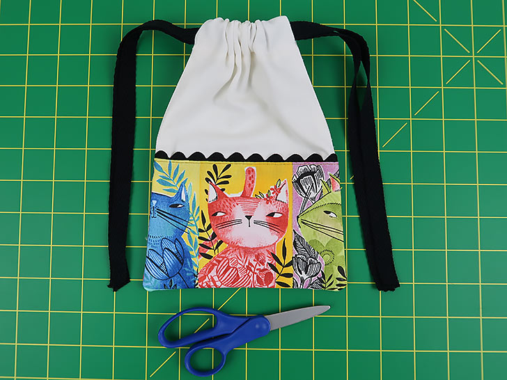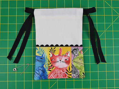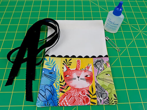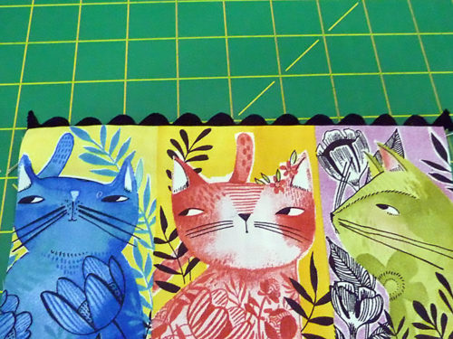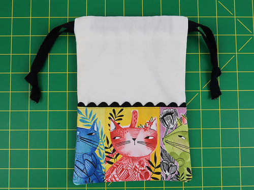 The front and back of each bag has a fun accent border made up of a fussy-cut quilting cotton and a length of rick rack trim. The personality-packed kitty cats we selected are from the Here Kitty Kitty collection by Cori Dantini for FreeSpirit Fabrics. We show you how to best center your favorite fabric to account for the upper trim line as well as the wider French seams along the sides and bottom.