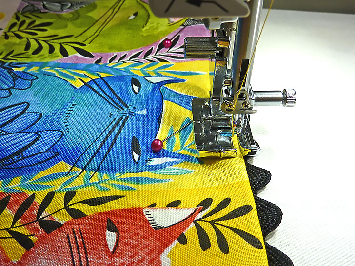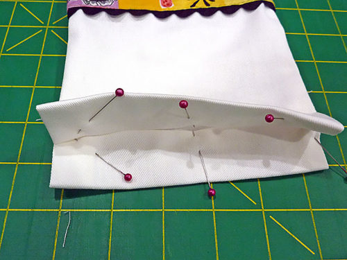 - Place a border across the bottom of each panel, overlaying the border on the panel so the sides and bottom raw edges of the two layers are flush. Pin in place.