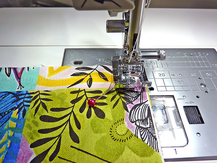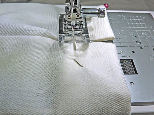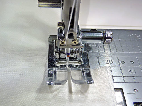 - Re-thread the machine with thread to best match the accent panel in the top and to best match the main panel fabric in the bobbin. Re-set for a slightly lengthened stitch, we like to use a 2.8mm – 3.0mm stitch length for most topstitching. We used our Quarter Inch Seam foot, but a standard foot would work as well.