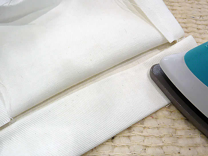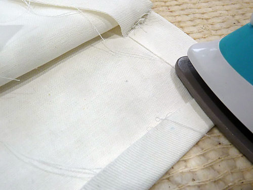 - Along the top free edge of both the front and back main panels, fold in the raw edges of the sides so they are flush with the sewn seam. Then, fold down and press the top raw edge along the front and back ½”.