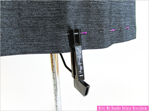 The Dritz® My Double Deluxe comes standard with a Pin Grip Hem Marker built into the pole. There’s a measuring scale on the post that registers the height from floor level. Lock this in position, then to mark the hem, slip the fabric between the plastic clamp, close the clamp, and insert a pin through the slot near the top. Open the clamp and repeat at intervals around the garment. Easy peasy.