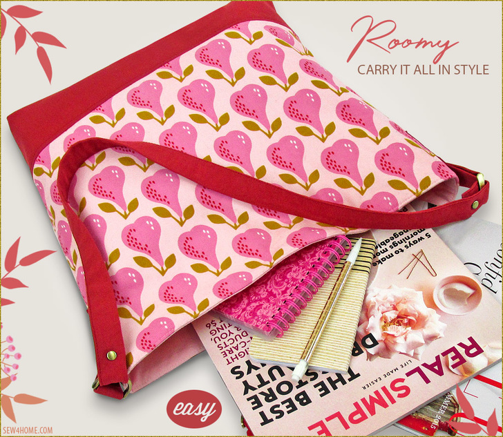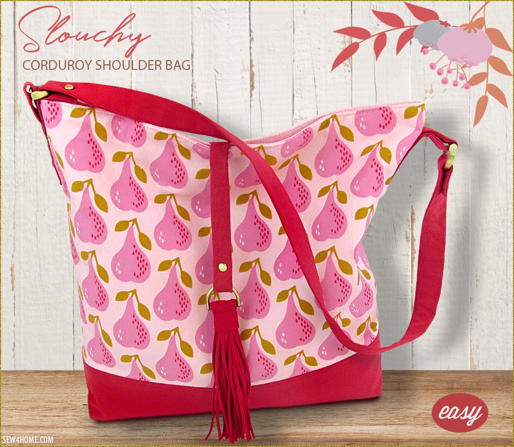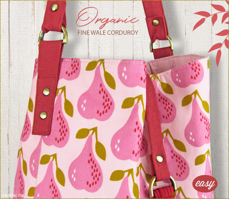 This slouchy shoulder bag is fast and easy but with a very stylish finish. When we saw an adorable corduroy pear print, we knew it would be perfect for a casual tote. A mid-weight canvas in a coordinating solid adds extra stability for the base and strap, and the smooth surface of the canvas is a lovely complement to the texture of the corduroy. The cool strap-and-tassel closure is a look we spotted at retail outlets on some of the trendiest designer bags.