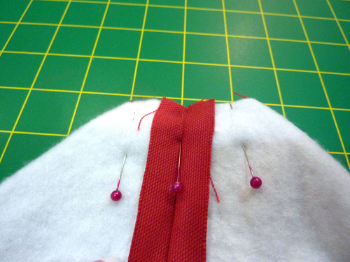 - Wrap the finished end of each strap tab through a D-Ring, bringing it back on itself about 1½”. Pin in place. When looped through the finished length of the tab should be 3½”.