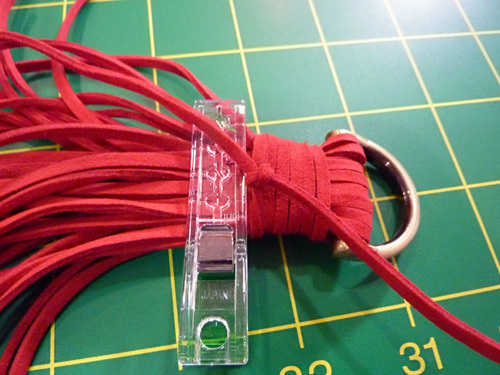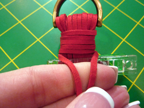 - Clamp the tassel strands in place below the D-Ring with a clip (we used a large Wonder Clip).