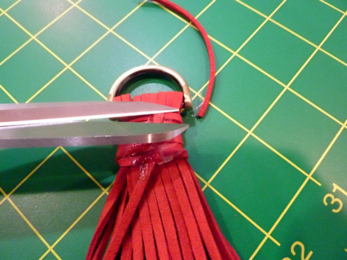 NOTE: The glue looks a little messy in the photo, but it dries quite clear, which means you do want to purchase/test your fabric glue beforehand to make sure it will dry clear. - Trim the ends of the tassel flush. Our tassel finished at approximately 5½”.