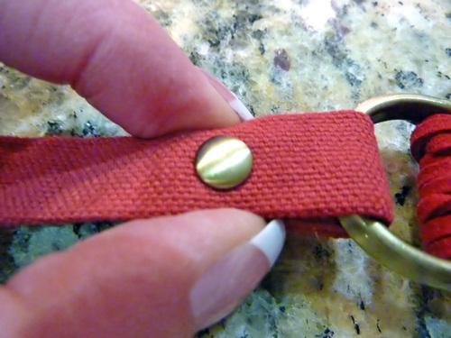 - Re-fold and re-pin the strap, aligning the cut holes. Set the rivet in place from front to back and snap the back rivet cap into place. Using the tools, hammer to seal.