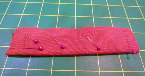 - Find the 2” x 7” tassel strap. Fold it in half, right sides together, so it is now 1” x 7”. Pin across one end and down the side. The opposite end remains raw.