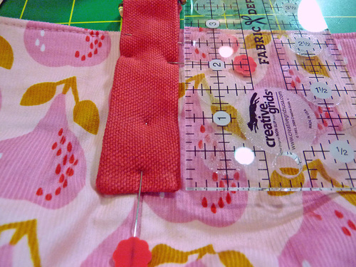 - Place the pocket on the lining panel. It should sit 3½” up from the bottom raw edge of the lining panel and be centered side to side. Pin in place along both sides and across the bottom.