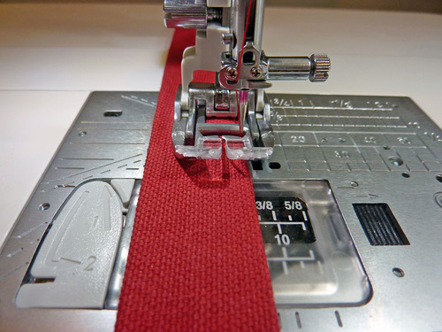 - Re-thread the machine with thread to best match the strap fabric in the top and bobbin.