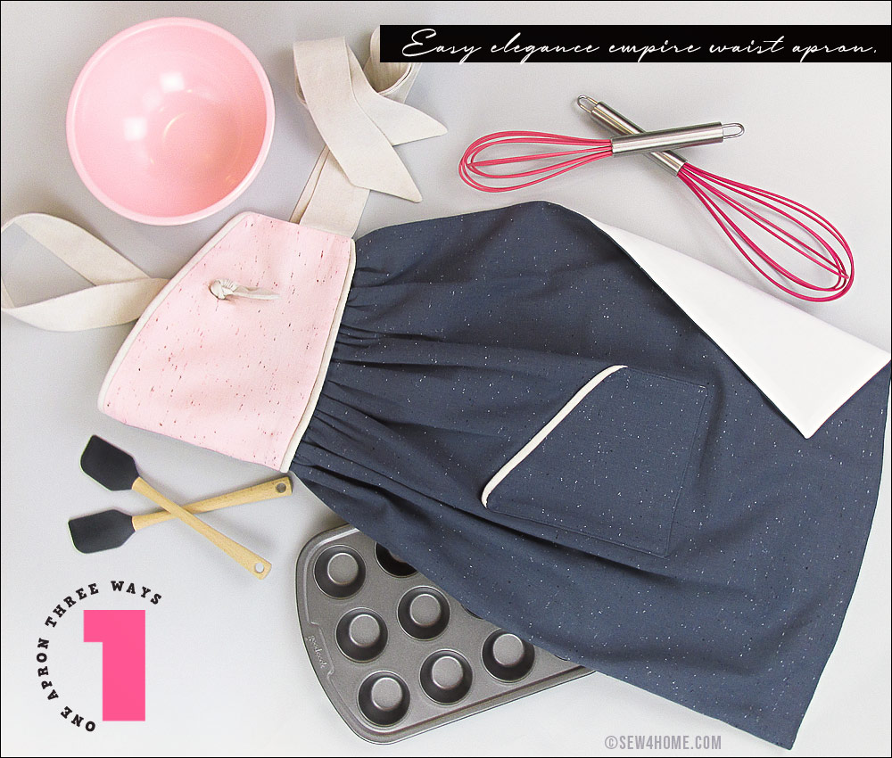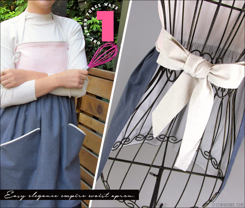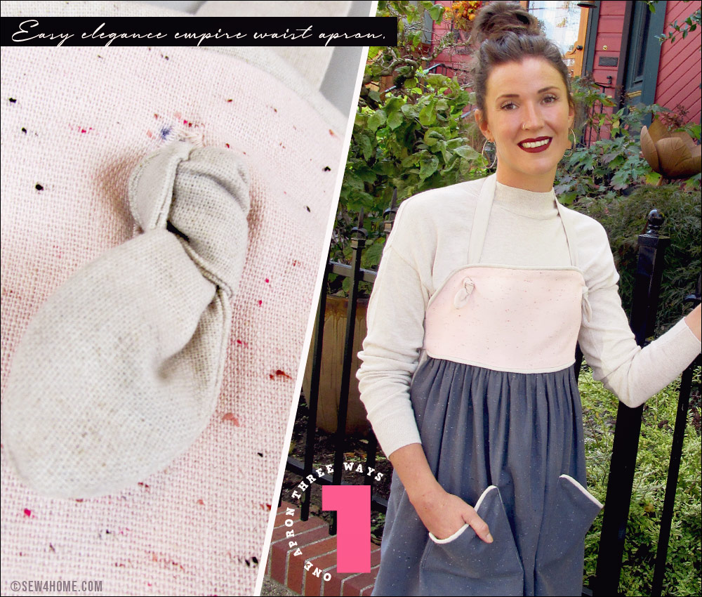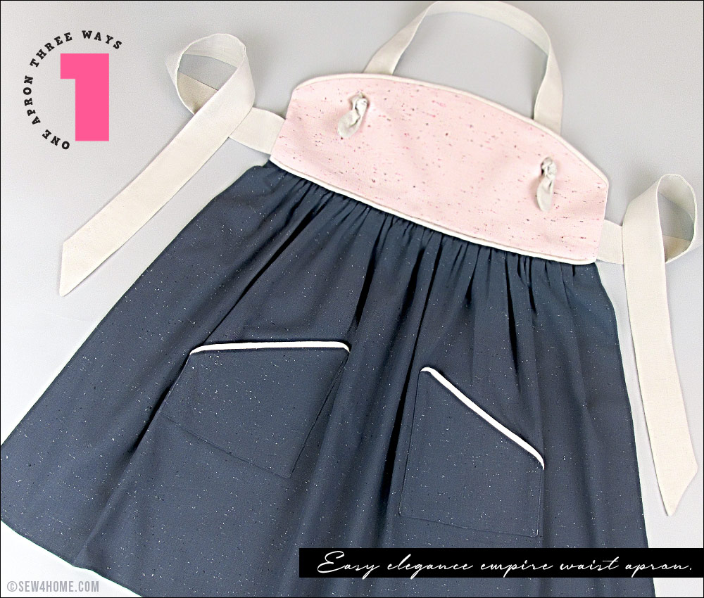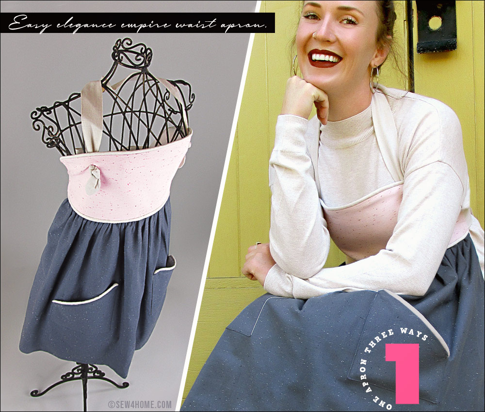 We’re back with our special series that highlights One Project Done Three Ways. Developed with our friends at Janome America, the goal is to show you the different looks that can be achieved using a variety of machines and features. We kick off we our Easy Elegance Apron. Just in time for holiday dinner planning and gift list strategizing, we created a pretty apron to show off a number of fun embellishments and sewing techniques. The basic design features an empire waist, piping accents, patch pockets, and wide sash ties.