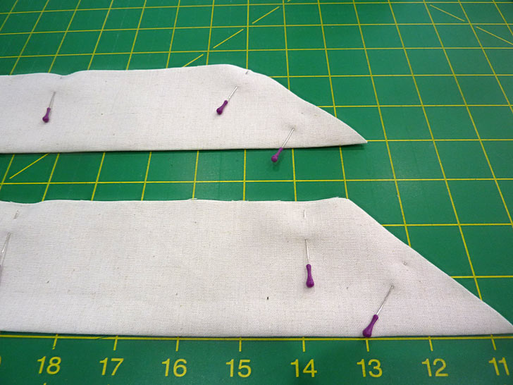 - Pin down the long side and across the angled end of each tie. The opposite end remains raw.