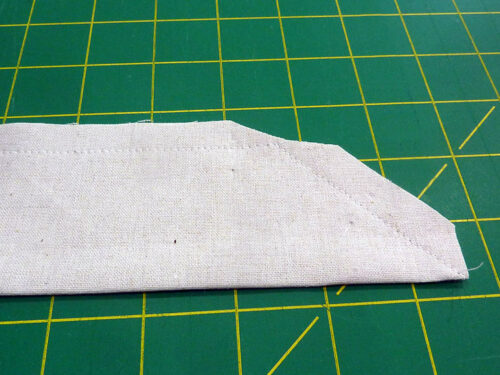 - Using a ½” seam allowance, stitch along the side and across the angled end, pivoting at the corner. Remember, that opposite end is left open for turning.