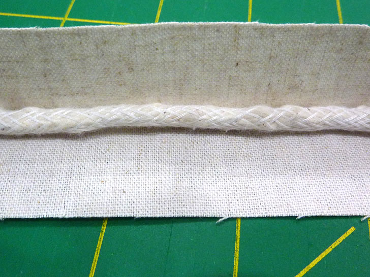- Wrap the fabric around the cording, wrong sides together, so all raw edges of the fabric are flush.