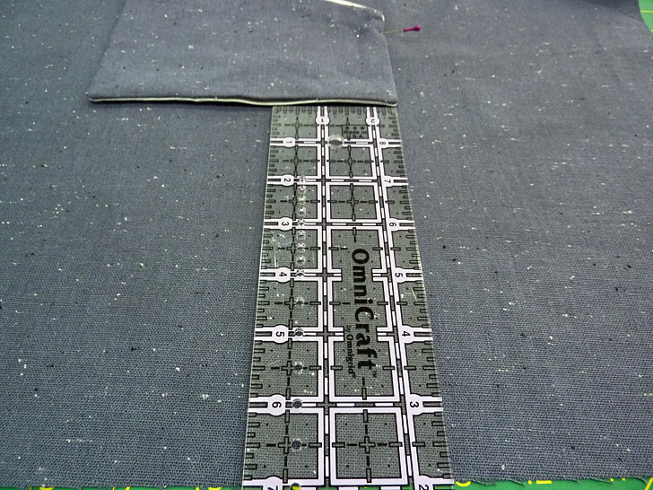 - Place the two pockets into position on the skirt panel. Each pocket should sit 7” in from the seamed side edge of the skirt panel and 7” up from the seamed bottom edge of the skirt panel.