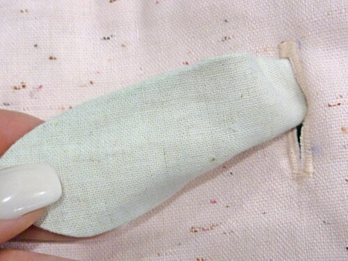 - Un-pin the ties. Turn the bodice right side out through the open bottom. Pull the ties out into position. Press flat; as above, a long, blunt tool, such as a knitting needle, chopstick or point turner will help smooth out the seam.