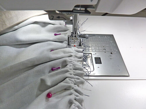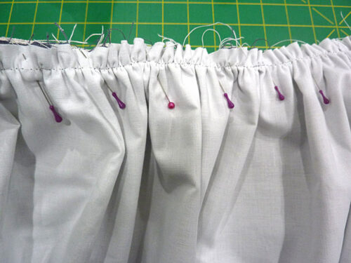 - Gather the top edge of the skirt panel. To do this, run one or two lines of machine basting across the panels, keeping the basting within the ½” seam allowance. Remember, don’t lock either end of your seam.