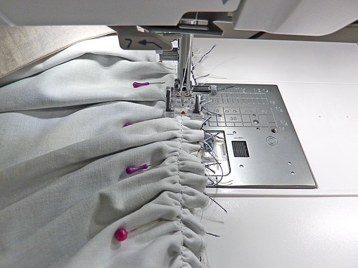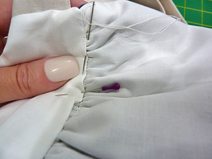 - Stitch across the top of the skirt through all the layers (remember, you are not stitching through the lining layer of the bodice). It’s best to stitch with the gathers facing up.