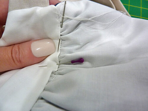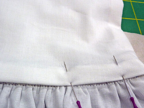 - It’s also a good idea to gather up the ends of the ties and lightly pin them in place at the center of the bodice so they will be out of the way of the perimeter seam.