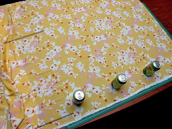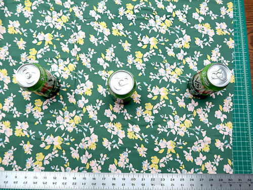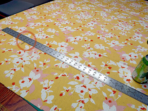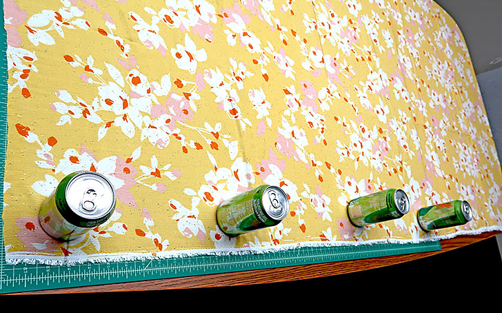 - Place your fabric right side up on your cutting mat, aligning the selvedge along a horizontal grid line on the cutting mat. This is a long piece of fabric that will likely extend beyond a standard cutting mat. That is okay, we’re dealing with one section at a time. The fabric is slippery and wiggly; simply do the best you can to align the selvedge and then secure it with pattern weights – we used a row of pop cans.