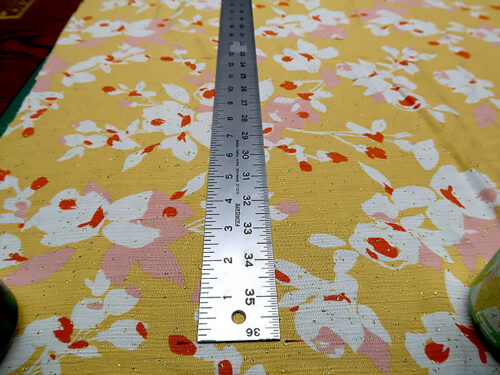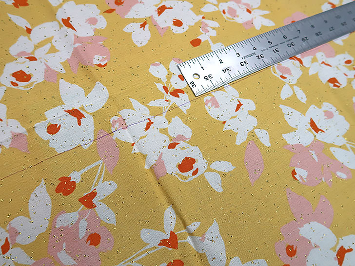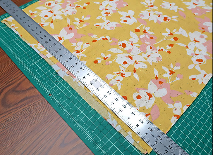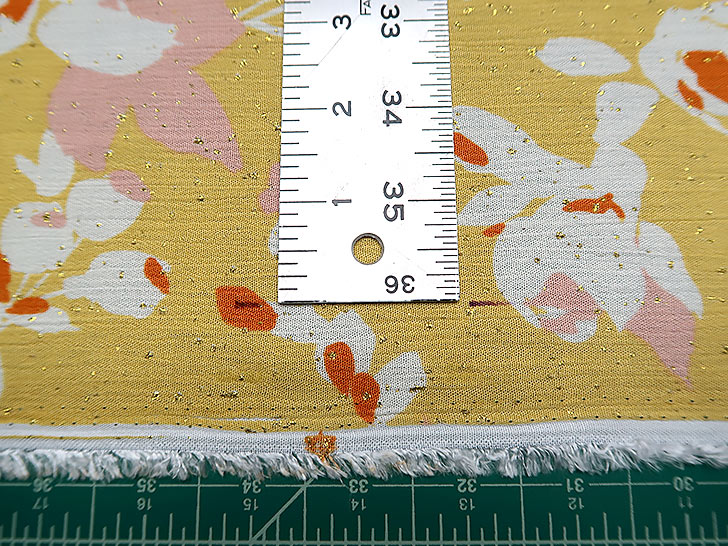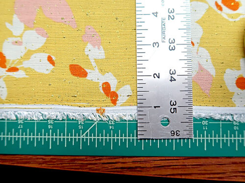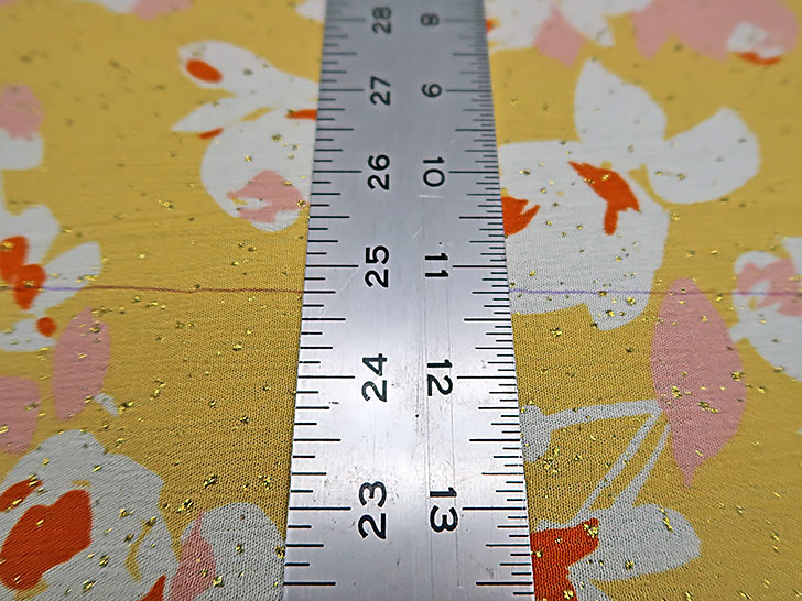 - Measure up, across the selvedge to a point that is a good 2” – 3” beyond your cut width (as mentioned above, our final cut width should be 24¾”). We measured up to 27” on our ruler.