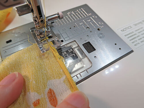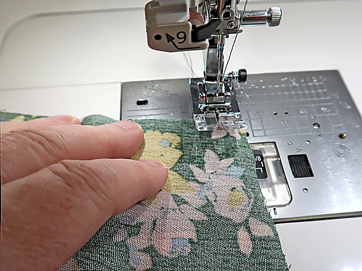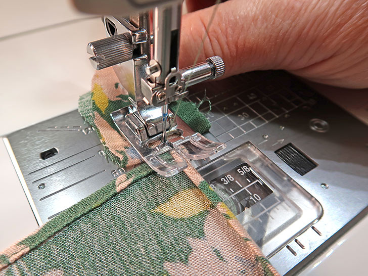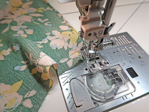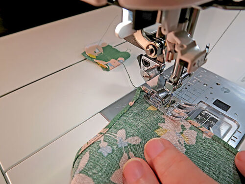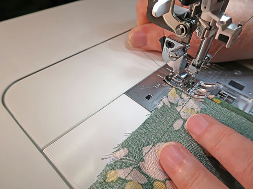 - Slip your fabric under the presser foot, sliding it forward that 2”, then drop the foot. Gently lift up the raw edge of the fabric and feed it into the front of the foot.