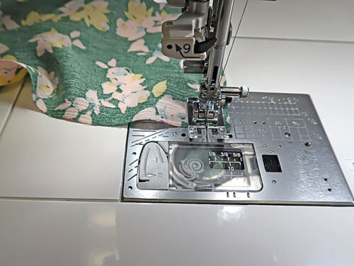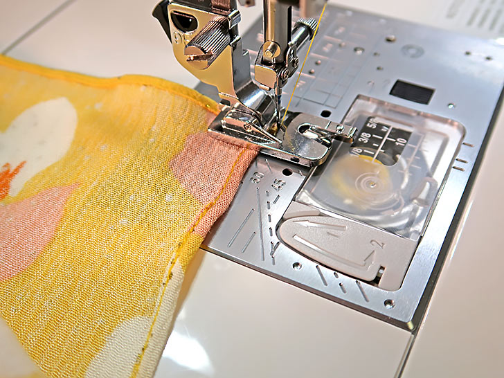 NOTE: We are using a standard Universal needle (#19) and 60-weight all purpose thread. The traditional rule of thumb is: the finer the fabric, the finer the needle and the thread. You could (and should) experiment with your needle and thread sizing. Testing first on scraps is never a bad idea to insure the very best outcome. - If possible, we recommend switching to a straight stitch needle plate. This type of plate adds stability for our thin fabric. We are using a standard presser foot. Our straight stitch length was also the standard/default on our Janome Continental M8: 2.40mm.