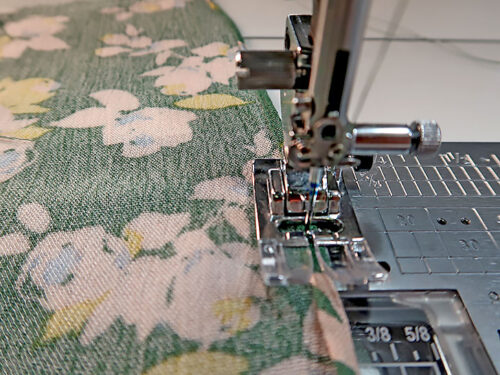- Start 2” in, rolling the raw edge into the Rolled Hem Foot.