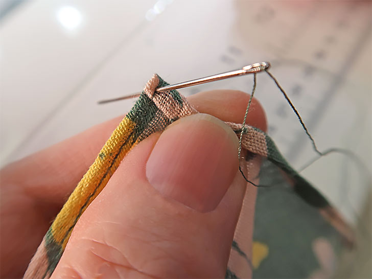 - Manually roll the starting 2” to match the machine sewn hem. This is easier than it sounds. Since the main hem is already done, the fabric kind of “wants” to roll in a similar manner to match.