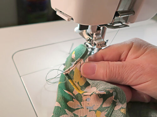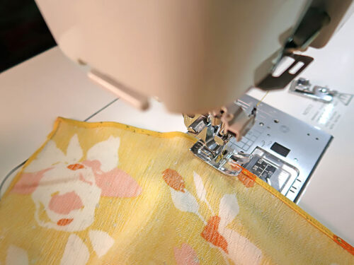 - Start the next side by placing the fabric under the foot. If you are practiced at making corners for something like cloth napkins, you can probably just start, forming a short starter “chain,” then allowing the feed dogs to catch the fabric and feed it into the rolled hem. However, with soft, slippery fabric such as rayon crepe or rayon challis, it is better to stop, lift the foot and place the fabric just under the foot. This will prevent the fabric from bunching.
