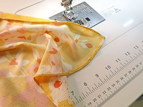 NOTE: For general background on working with fancy fabrics, such as the rayon crepe we are using for our scarves, you can also look at our Sewing with Sheers article as well as our Sewing Tips for Specialty Fabrics article.